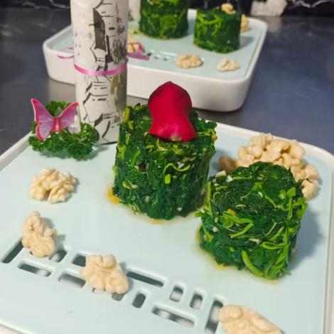 选新鲜天麻叶,经炝拌调味,口感脆嫩,咸香适中,解腻开胃,是佐餐佳品。